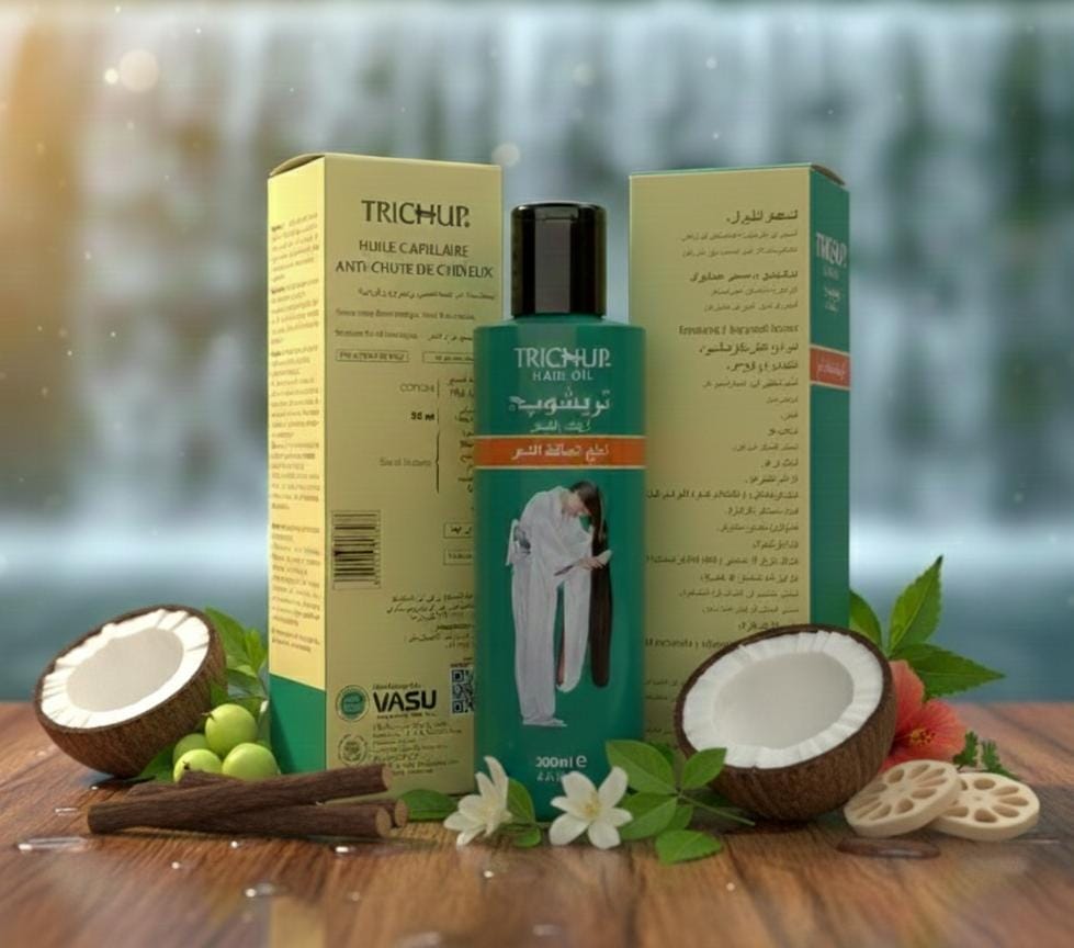 زيت تريك أب – للتحكم في تساقط الشعر غني بخيرات زيت السمسم وزيت جوز الهند ومستخلصات الأعشاب مثل الأملا، عرق السوس (يشتيمادهو)، والبهرنجراج، المعروفة بقدرتها على تقليل تساقط الشعر وتقوية البصيلات. الاستخدام المنتظم يغذي فروة الرأس، يمنع الجفاف وتقصف الأطراف، ويترك الشعر صحيًا، لامعًا وناعمًا. مناسب لجميع أنواع الشعر، يعزز قوة وحيوية الشعر ويحسن صحة الفروة بشكل عام.