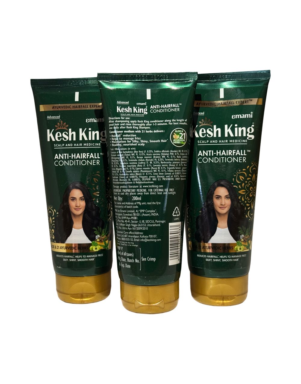 Kesh King Anti-Hairfall Conditioner is a unique Ayurvedic blend enriched with 21 precious herbs including Aloe Vera, Amla, Neem, Bhringraj, Tulsi, and Shikakai. This advanced herbal formula deeply nourishes the scalp, strengthens hair from the roots, and helps reduce hair fall while restoring natural shine and smoothness. It detangles your hair effortlessly, making it soft, frizz-free, and silky to the touch. Free from parabens, sulphates, silicones, and synthetic dyes, this pure Ayurvedic conditioner is safe for regular use and suitable for all hair types — perfect for the entire family.