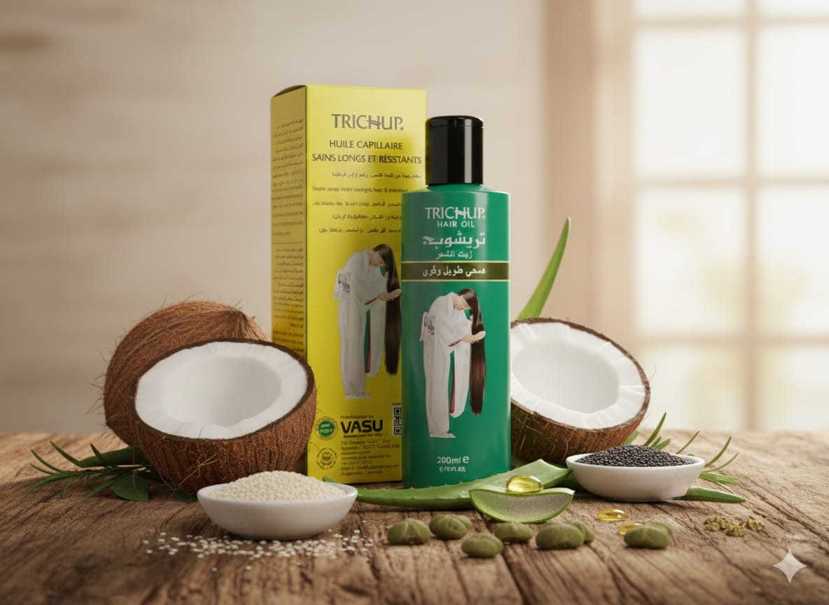 زيت تريك أب – صحي، طويل وقوي غني بـ زيت السمسم وزيت جوز الهند وأعشاب مثل الألوفيرا ونييم، المعروفة بتعزيز صحة الشعر، قوته وطوله. هذه التركيبة الأيورفيدية تخترق جذور الشعر بعمق، تغذي البصيلات وتعزز نمو الشعر الطبيعي. الاستخدام المنتظم يحافظ على ترطيب الشعر، يقلل من التكسر، ويتركه لامعًا، ناعمًا وسهل التسريح. مناسب لجميع أنواع الشعر، ويثق به ملايين المستخدمين ويوصى به من قبل خبراء الشعر.